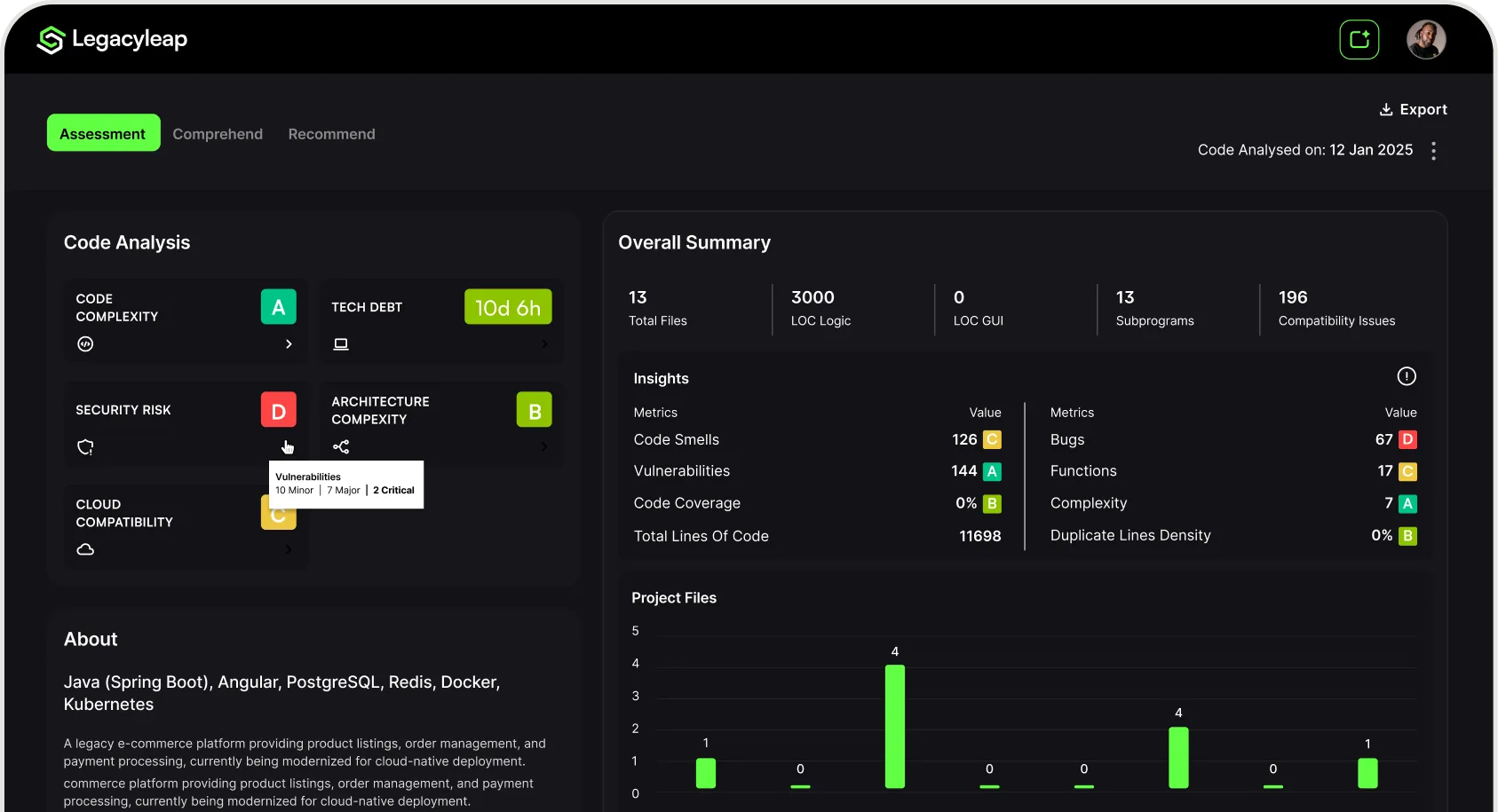 Agentic modernization platform that analyzes legacy codebases, generates documentation, recommends target architecture, automates code conversion with 100% parity.