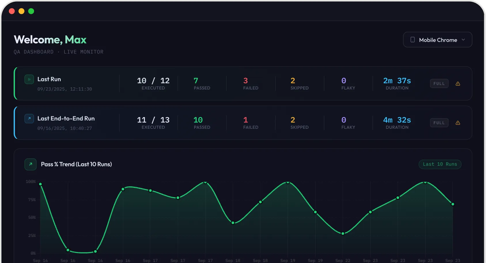 - Regression and smoke testing: Every release scanned automatically for breakages in critical flows before it reaches your users