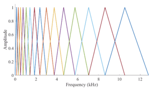 - Mel Filterbank: The power spectrum is passed through a Mel filterbank, which is a set of triangular bandpass filters that are spaced on the Mel frequency scale. The output of each filter is the energy within that frequency band. The diagram below shows you an example of Mel filter bank