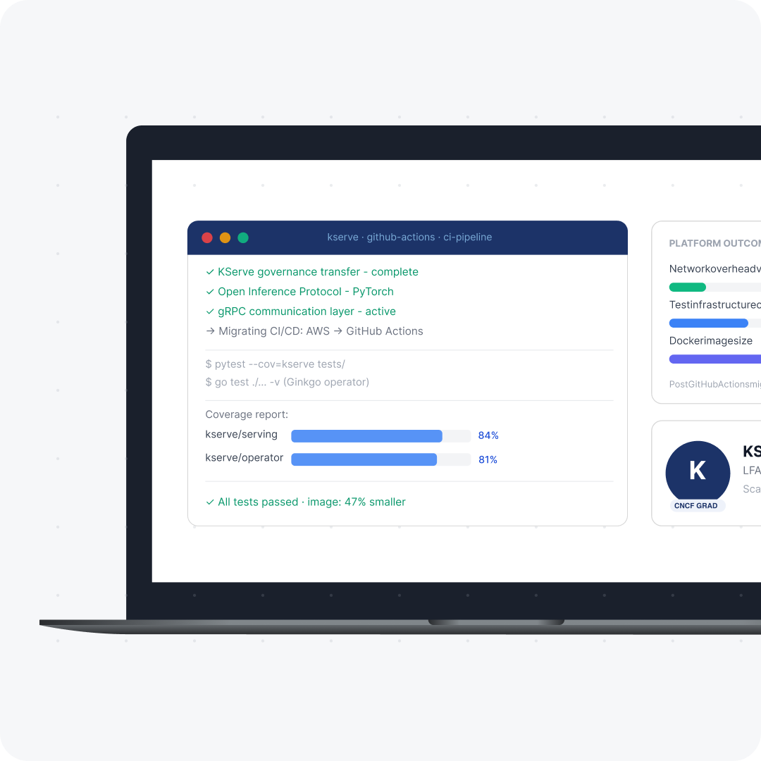 Restructuring CI/CD onto GitHub Actions cut test infrastructure cost by 68% and image size by 47%. gRPC adoption reduced network overhead by 85%. Test coverage reached 84% from a 50% baseline. KServe graduated from LFAI incubation to CNCF, with serverless scale-to-zero in production.