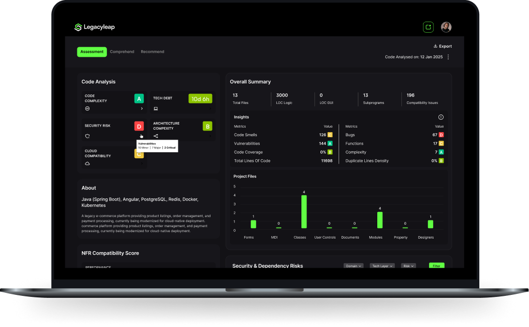 This operating model is accelerated by Legacyleap, the agentic modernization platform that embeds this experience directly into the workflow. Legacyleap automates the heavy lifting across assessment, refactoring, and validation, allowing modernization teams to move faster while maintaining control, traceability, and confidence in production outcomes.